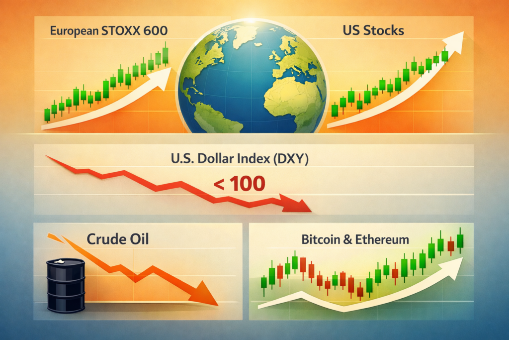 Uno de los movimientos más destacados en los mercados globales hoy es la caída del dólar. El índice DXY ha retrocedido por debajo del nivel psicológico de 100, reflejando un menor apetito por activos refugio.